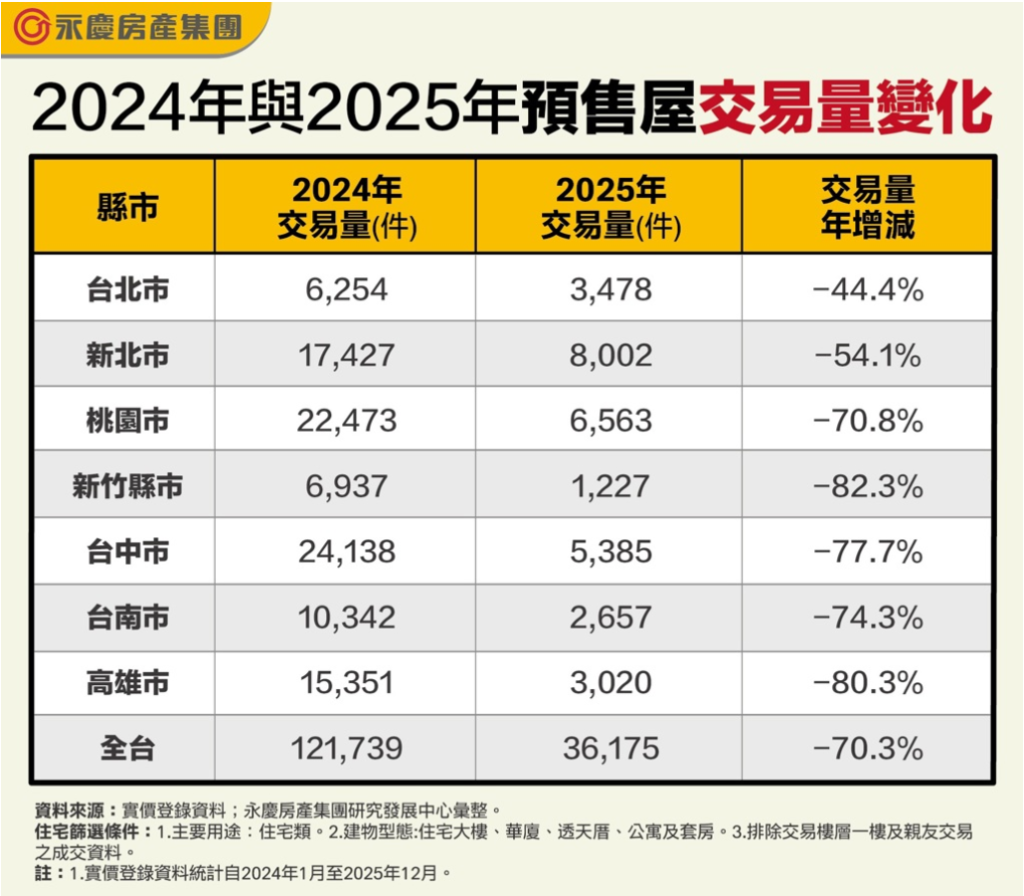 在央行信用管制續行、房貸條件嚴峻的影響下,2025年預售屋市場買氣明顯降溫。永慶房產集團比較2024年與2025年七大都會區和全台預售屋交易狀況發現,全台預售屋交易量從12.2萬件大幅下滑至3.6萬件,年減幅高達70.3%,顯示預售市場進入明顯的量縮階段,購屋族進場態度趨於保守。