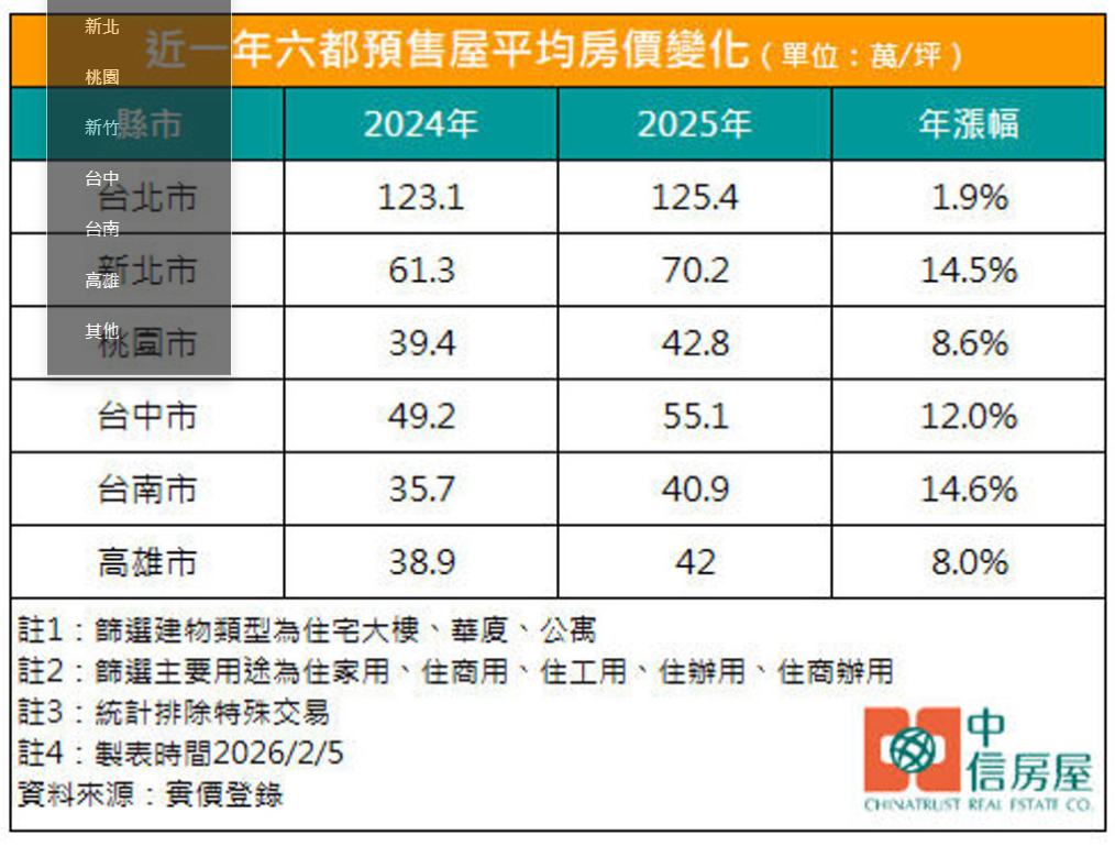 儘管整體房市交易動能放緩,但預售屋房價卻仍持續飆高。依據實價登錄資料顯示,六都預售屋房價皆呈現上漲趨勢,其中又以台南的漲幅最為顯著,平均單價由2024年的每坪35.7萬元上升至2025年的每坪40.9萬元,年漲幅達14.6%;新北市緊追在後,年漲幅14.5%,均價來到每坪70.2萬元;台中市年漲幅12.0%、桃園市8.6%、高雄市8.0%,就連房價基期相對較高的台北市也小幅成長1.9%。